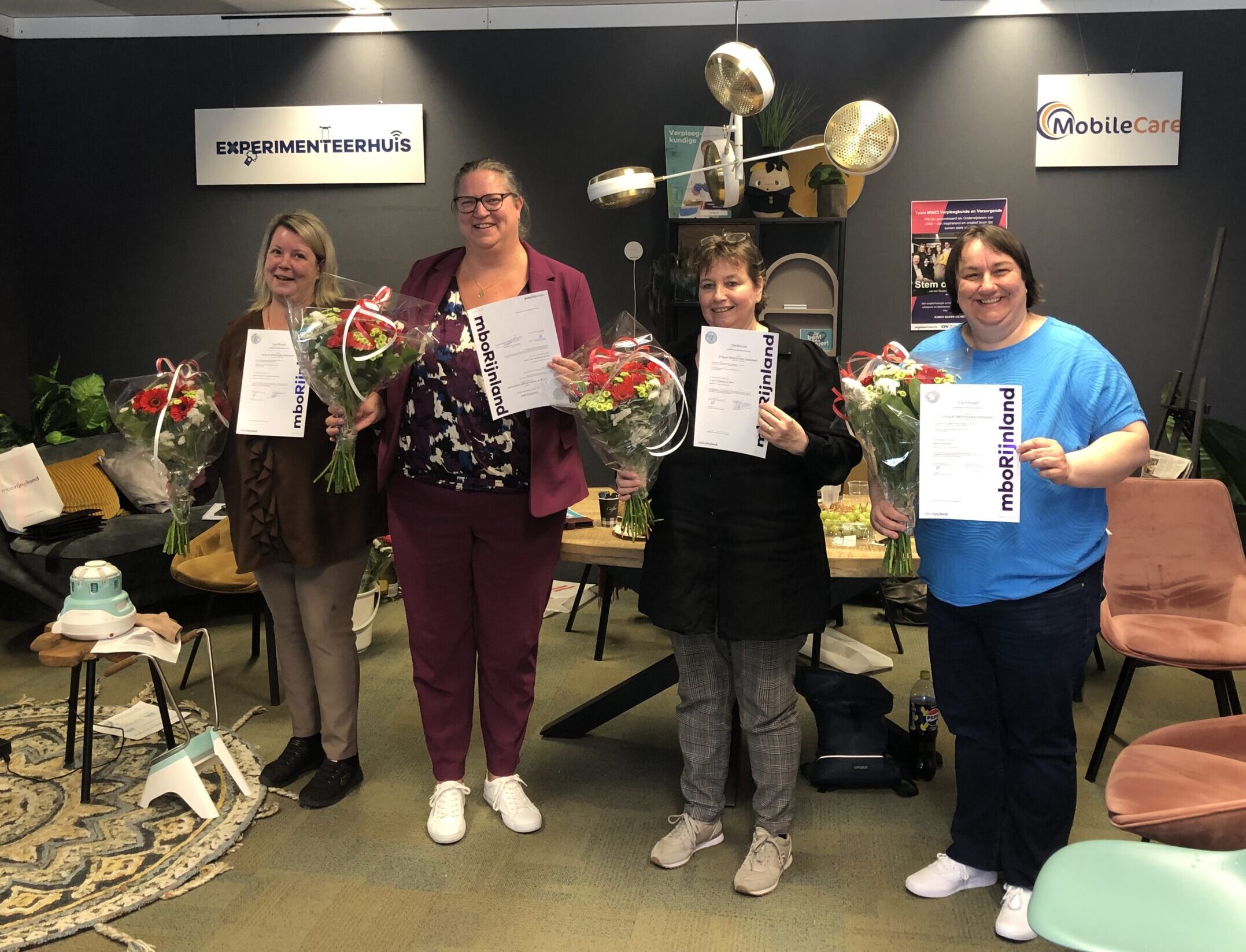 De uitreiking vond plaats in Het Experimenteerhuis en werd gedaan door Arianne, projectleider van het Experimenteerhuis, en Maria-Lotte, trainer van mboRijnland. De deelnemers kregen als blijk van waardering een mooie bos bloemen van Jeroen Veugelers, directeur van Dovida ZHM.