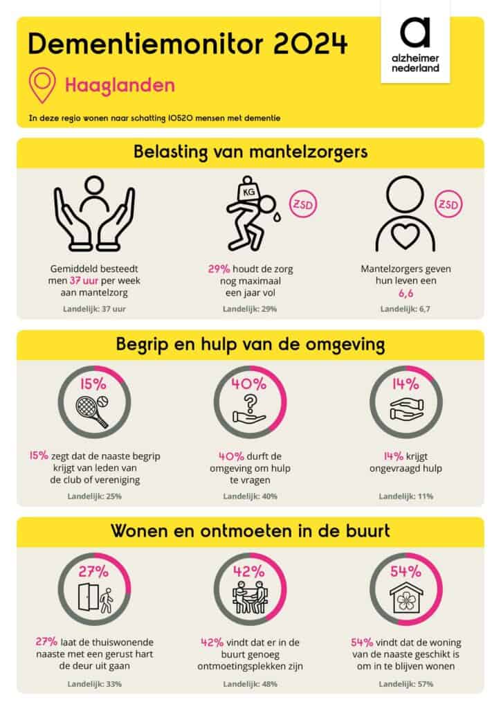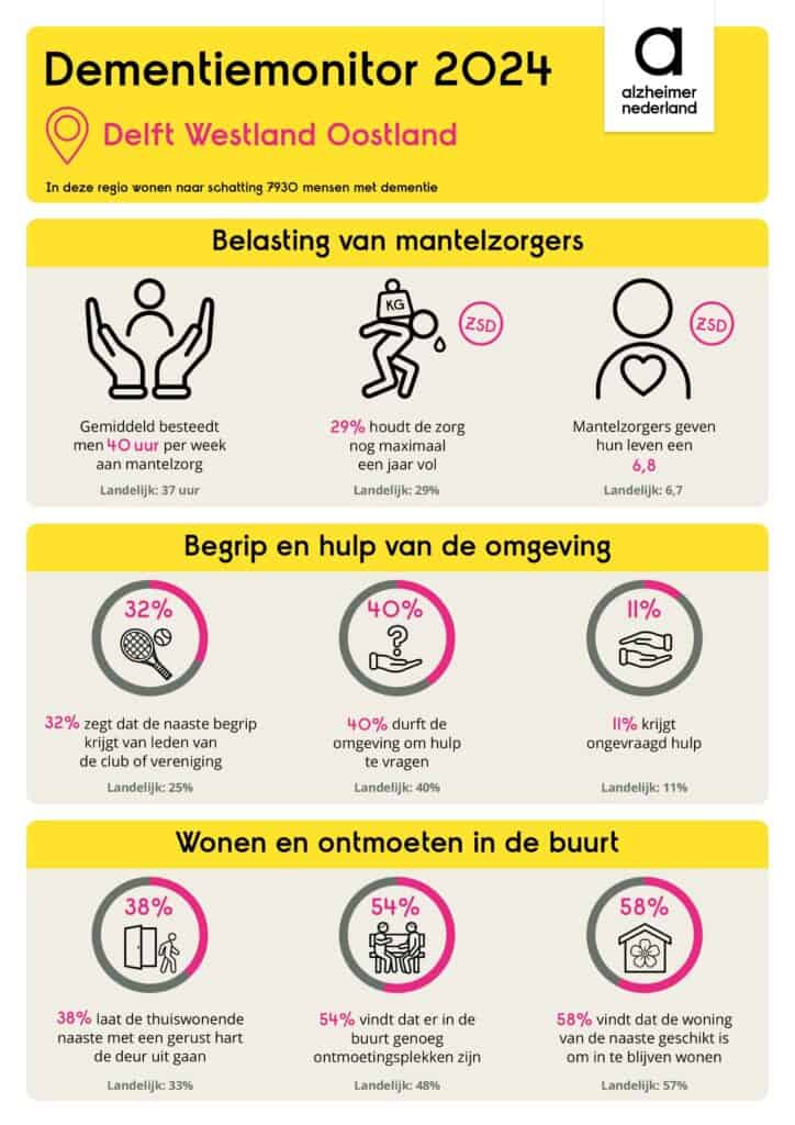 Iedere twee jaar houdt Alzheimer Nederland een grootschalig onderzoek onder mantelzorgers van mensen met dementie. De resultaten worden gedeeld in een landelijk rapport, maar ook per regio. Dit zijn de belangrijkste uitkomsten voor de regio Rijswijk, Leidschendam-Voorburg, Ypenburg, Leidscheveen en Zoetermeer (Haaglanden), regio Delft en Pijnacker Noordorp (Delft Westland Oostland) en regio Maassluis, Schiedam en Vlaardingen (Nieuwe Waterweg Noord).