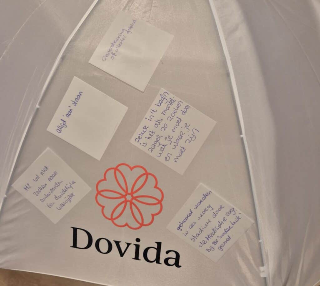 Namens Dovida verwelkomde Klantcoördinator Ellen van Marion bezoekers onder de herkenbare ‘Dovida-paraplu’. Er werd actief het gesprek aangegaan met mantelzorgers over hun behoeften en ervaringen. Bezoekers konden hun wensen op plakmemo’s schrijven. Deze waardevolle input wordt meegenomen in de verdere ontwikkeling van onze dienstverlening en als inspiratie voor gerichte content.